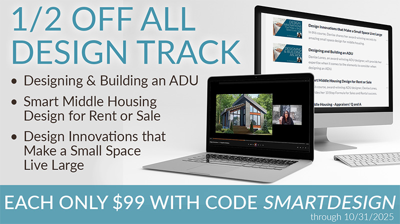 Get any - or all - of Denise’s 3 ADU and middle housing design courses for $99 each with the code SMARTDESIGN