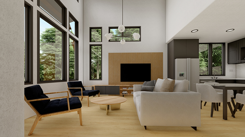 Look at the large, strategically-placed windows, ceiling height, and use of wood and natural materials: